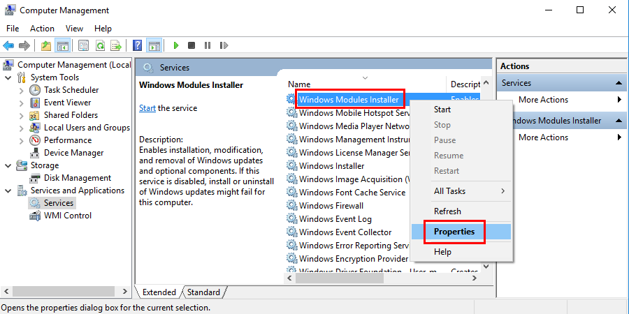 - Once you find it, right-click the Windows Module Installer option and select Properties.